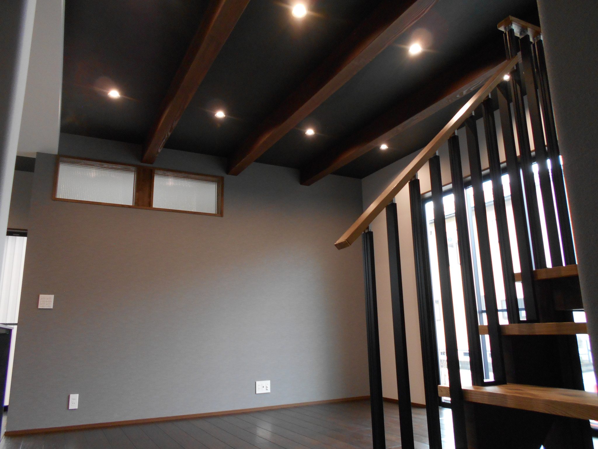リビングは梁を見せ、天井を落ち着いた色に仕上げたことで