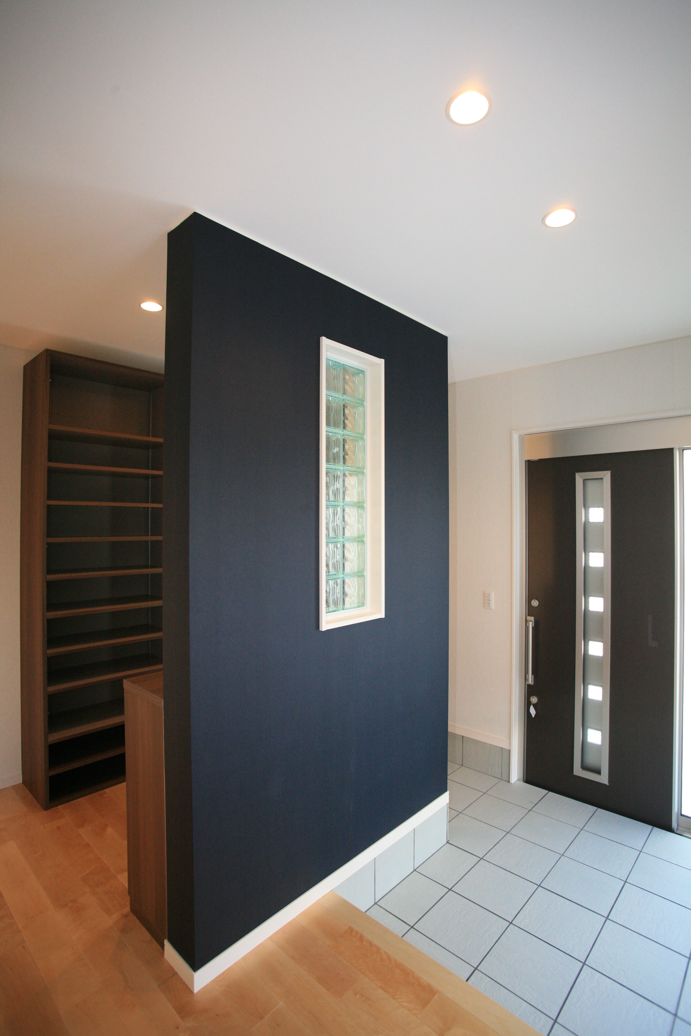 サブ玄関との間取り壁に強いアクセントカラーを使って、きりっと締まった印象の玄関に!